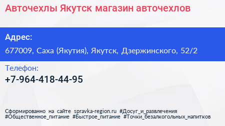 Авточехлы Якутск, магазин авточехлов по адресу 677009, Саха (Якутия), Якутск, Дзержинского, 52/2 в дальнейшем Организация, размещена в следующих категориях: