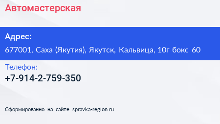 Автомастерская по адресу 677001, Саха (Якутия), Якутск, Кальвица, 10г бокс 60 в дальнейшем Организация, размещена в следующих категориях: