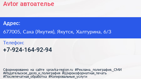 Avtor, автоателье по адресу 677005, Саха (Якутия), Якутск, Халтурина, 6/3 в дальнейшем Организация, размещена в следующих категориях: