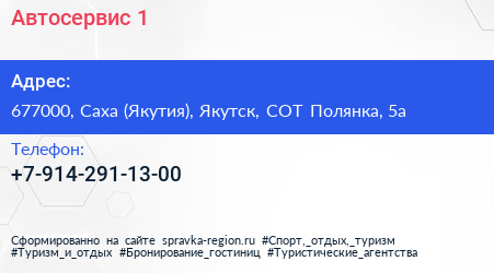 Автосервис №1 по адресу 677000, Саха (Якутия), Якутск, СОТ Полянка, 5а в дальнейшем Организация, размещена в следующих категориях: