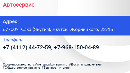 Автосервис по адресу 677009, Саха (Якутия), Якутск, Жорницкого, 22/1Б в дальнейшем Организация, размещена в следующих категориях: