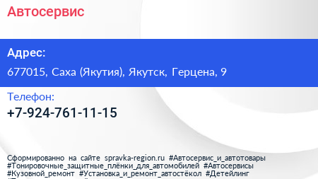 Автосервис по адресу 677015, Саха (Якутия), Якутск, Герцена, 9 в дальнейшем Организация, размещена в следующих категориях: