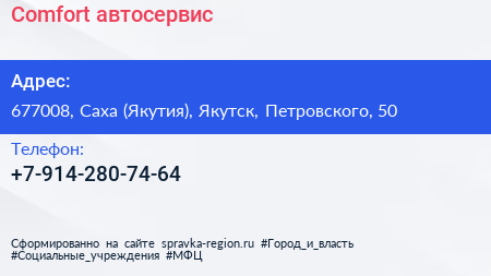Comfort, автосервис по адресу 677008, Саха (Якутия), Якутск, Петровского, 50 в дальнейшем Организация, размещена в следующих категориях: