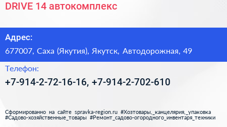 DRIVE 14, автокомплекс по адресу 677007, Саха (Якутия), Якутск, Автодорожная, 49 в дальнейшем Организация, размещена в следующих категориях: