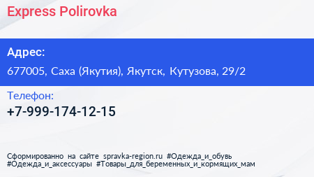 Express Polirovka по адресу 677005, Саха (Якутия), Якутск, Кутузова, 29/2 в дальнейшем Организация, размещена в следующих категориях: