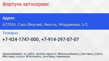 Фортуна, автосервис по адресу 677014, Саха (Якутия), Якутск, Мординова, 5/1 в дальнейшем Организация, размещена в следующих категориях: