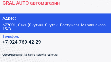 GRAL AUTO, автомагазин по адресу 677001, Саха (Якутия), Якутск, Бестужева-Марлинского, 15/3 в дальнейшем Организация, размещена в следующих категориях: