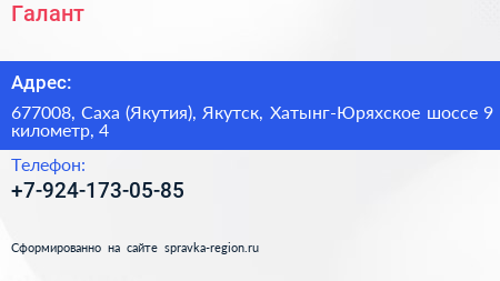 Галант по адресу 677008, Саха (Якутия), Якутск, Хатынг-Юряхское шоссе 9 километр, 4 в дальнейшем Организация, размещена в следующих категориях: