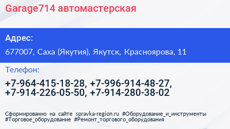 Garage714, автомастерская по адресу 677007, Саха (Якутия), Якутск, Красноярова, 11 в дальнейшем Организация, размещена в следующих категориях: