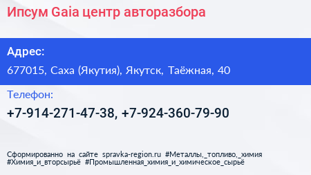 Ипсум Gaia, центр авторазбора по адресу 677015, Саха (Якутия), Якутск, Таёжная, 40 в дальнейшем Организация, размещена в следующих категориях: