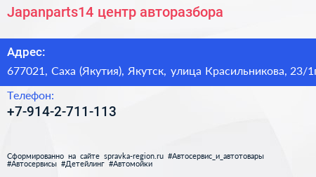 Japanparts14, центр авторазбора по адресу 677021, Саха (Якутия), Якутск, улица Красильникова, 23/1г в дальнейшем Организация, размещена в следующих категориях: