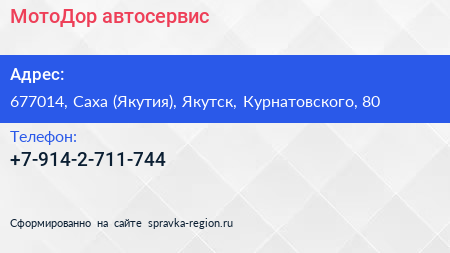 МотоДор, автосервис по адресу 677014, Саха (Якутия), Якутск, Курнатовского, 80 в дальнейшем Организация, размещена в следующих категориях: