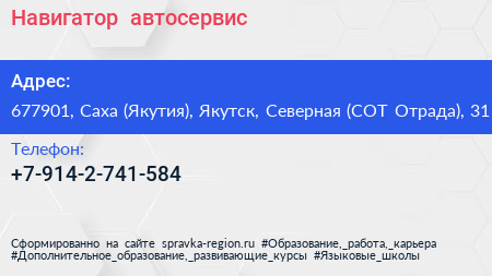Навигатор+, автосервис по адресу 677901, Саха (Якутия), Якутск, Северная (СОТ Отрада), 31 в дальнейшем Организация, размещена в следующих категориях: