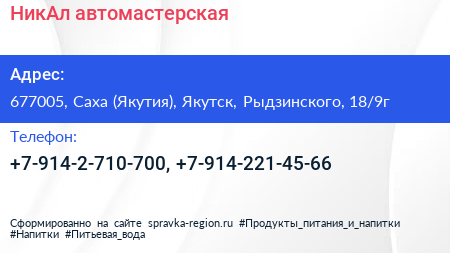 НикАл, автомастерская по адресу 677005, Саха (Якутия), Якутск, Рыдзинского, 18/9г в дальнейшем Организация, размещена в следующих категориях: