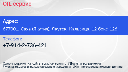 OIL-сервис по адресу 677001, Саха (Якутия), Якутск, Кальвица, 12 бокс 126 в дальнейшем Организация, размещена в следующих категориях: