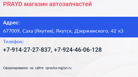 PRAYD, магазин автозапчастей по адресу 677009, Саха (Якутия), Якутск, Дзержинского, 42 к3 в дальнейшем Организация, размещена в следующих категориях: