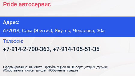 Pride, автосервис по адресу 677018, Саха (Якутия), Якутск, Чепалова, 30а в дальнейшем Организация, размещена в следующих категориях: