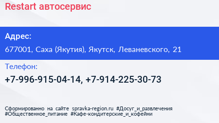 Restart, автосервис по адресу 677001, Саха (Якутия), Якутск, Леваневского, 21 в дальнейшем Организация, размещена в следующих категориях: