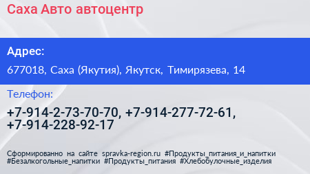 Саха Авто, автоцентр по адресу 677018, Саха (Якутия), Якутск, Тимирязева, 14 в дальнейшем Организация, размещена в следующих категориях: