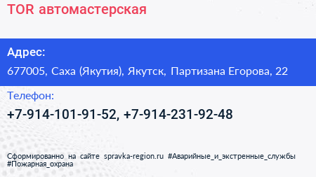 TOR, автомастерская по адресу 677005, Саха (Якутия), Якутск, Партизана Егорова, 22 в дальнейшем Организация, размещена в следующих категориях:
