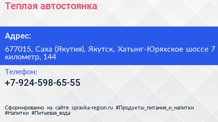 Теплая автостоянка по адресу 677015, Саха (Якутия), Якутск, Хатынг-Юряхское шоссе 7 километр, 144 в дальнейшем Организация, размещена в следующих категориях: