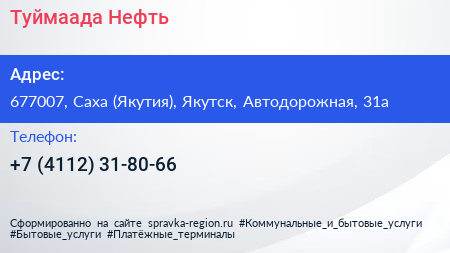 Туймаада-Нефть по адресу 677007, Саха (Якутия), Якутск, Автодорожная, 31а в дальнейшем Организация, размещена в следующих категориях: