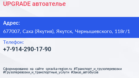 UPGRADE, автоателье по адресу 677007, Саха (Якутия), Якутск, Чернышевского, 118г/1 в дальнейшем Организация, размещена в следующих категориях: