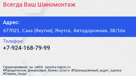 Всегда Ваш Шиномонтаж по адресу 677021, Саха (Якутия), Якутск, Автодорожная, 38/16а в дальнейшем Организация, размещена в следующих категориях: