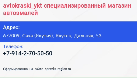 avtokraski_ykt, специализированный магазин автоэмалей по адресу 677009, Саха (Якутия), Якутск, Дальняя, 53 в дальнейшем Организация, размещена в следующих категориях: