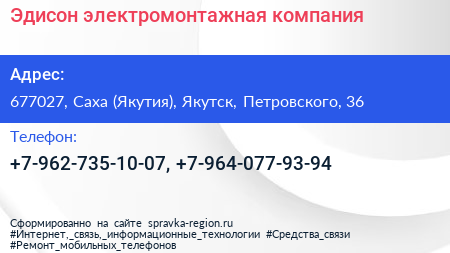 Эдисон, электромонтажная компания по адресу 677027, Саха (Якутия), Якутск, Петровского, 36 в дальнейшем Организация, размещена в следующих категориях: