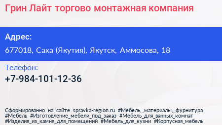 Грин Лайт, торгово-монтажная компания по адресу 677018, Саха (Якутия), Якутск, Аммосова, 18 в дальнейшем Организация, размещена в следующих категориях:
