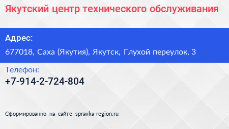 Якутский центр технического обслуживания по адресу 677018, Саха (Якутия), Якутск, Глухой переулок, 3 в дальнейшем Организация, размещена в следующих категориях: