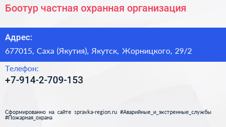 Боотур, частная охранная организация по адресу 677015, Саха (Якутия), Якутск, Жорницкого, 29/2 в дальнейшем Организация, размещена в следующих категориях: