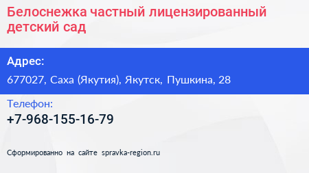Белоснежка, частный лицензированный детский сад по адресу 677027, Саха (Якутия), Якутск, Пушкина, 28 в дальнейшем Организация, размещена в следующих категориях: