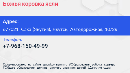 Божья коровка, ясли по адресу 677021, Саха (Якутия), Якутск, Автодорожная, 10/2в в дальнейшем Организация, размещена в следующих категориях: