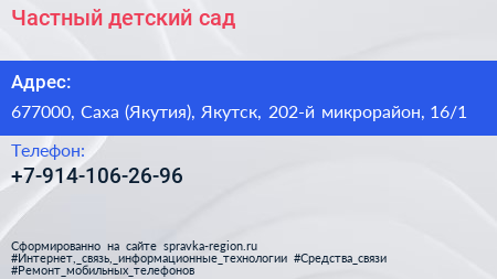 Частный детский сад по адресу 677000, Саха (Якутия), Якутск, 202-й микрорайон, 16/1 в дальнейшем Организация, размещена в следующих категориях: