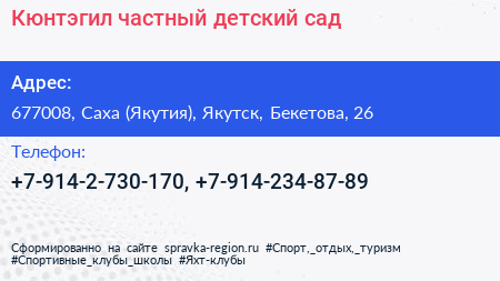 Кюнтэгил, частный детский сад по адресу 677008, Саха (Якутия), Якутск, Бекетова, 26 в дальнейшем Организация, размещена в следующих категориях: