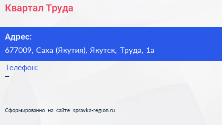 Квартал Труда по адресу 677009, Саха (Якутия), Якутск, Труда, 1а в дальнейшем Организация, размещена в следующих категориях: