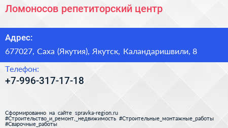 Ломоносов, репетиторский центр по адресу 677027, Саха (Якутия), Якутск, Каландаришвили, 8 в дальнейшем Организация, размещена в следующих категориях: