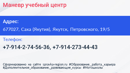 Маневр, учебный центр по адресу 677027, Саха (Якутия), Якутск, Петровского, 19/5 в дальнейшем Организация, размещена в следующих категориях: