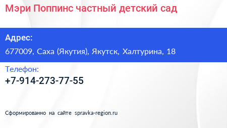 Мэри Поппинс, частный детский сад по адресу 677009, Саха (Якутия), Якутск, Халтурина, 18 в дальнейшем Организация, размещена в следующих категориях: