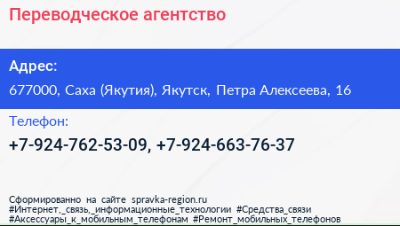 Переводческое агентство по адресу 677000, Саха (Якутия), Якутск, Петра Алексеева, 16 в дальнейшем Организация, размещена в следующих категориях: