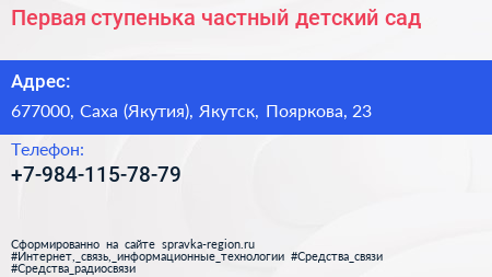 Первая ступенька, частный детский сад по адресу 677000, Саха (Якутия), Якутск, Пояркова, 23 в дальнейшем Организация, размещена в следующих категориях: