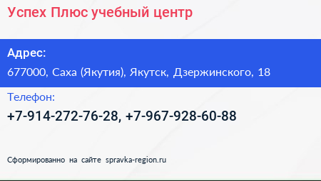 Успех Плюс, учебный центр по адресу 677000, Саха (Якутия), Якутск, Дзержинского, 18 в дальнейшем Организация, размещена в следующих категориях: