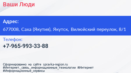 Ваши Люди по адресу 677008, Саха (Якутия), Якутск, Вилюйский переулок, 8/1 в дальнейшем Организация, размещена в следующих категориях: