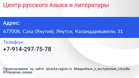 Центр русского языка и литературы по адресу 677008, Саха (Якутия), Якутск, Каландаришвили, 31 в дальнейшем Организация, размещена в следующих категориях: