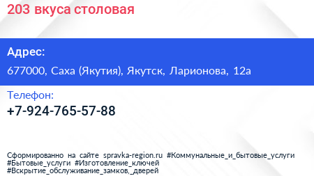 203 вкуса, столовая по адресу 677000, Саха (Якутия), Якутск, Ларионова, 12а в дальнейшем Организация, размещена в следующих категориях: