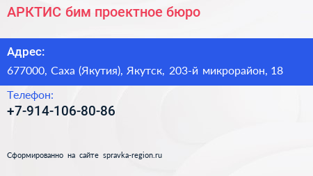 АРКТИС, бим-проектное бюро по адресу 677000, Саха (Якутия), Якутск, 203-й микрорайон, 18 в дальнейшем Организация, размещена в следующих категориях: