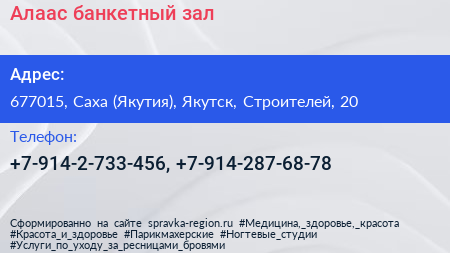 Алаас, банкетный зал по адресу 677015, Саха (Якутия), Якутск, Строителей, 20 в дальнейшем Организация, размещена в следующих категориях:
