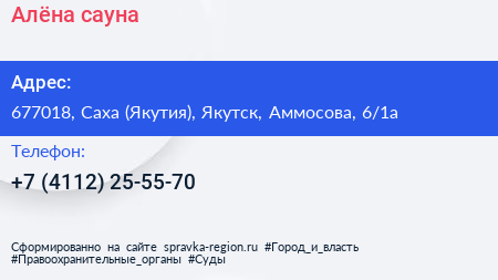 Алёна, сауна по адресу 677018, Саха (Якутия), Якутск, Аммосова, 6/1а в дальнейшем Организация, размещена в следующих категориях: